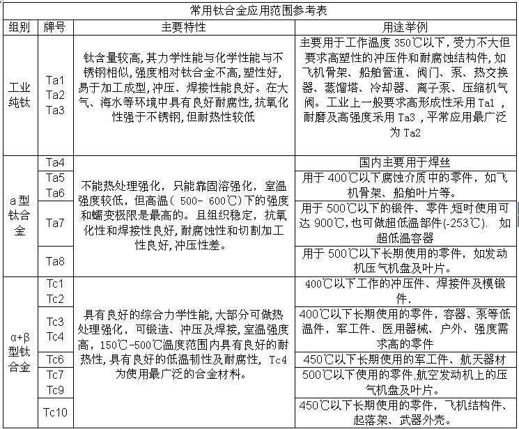 TA1、TA2、TA3、TA4、TA5、TA6、TA7、ELI、TA9、TA10、TB2、TB3、TB4、TC1、TC2、TC3、TC4、TC6、TC9、TC10、TC11、TC12、BT3-1、BT15、BT3、48-OT3、T-A6V、Ti-811、β-C、BT1-1、BT1-0、Ti5AL-2.5Sn、BT1-2、BT1-000CB、BT10、β-21S、BT1-0、BT1-1 BT1-2、BT1-00、BT1-0 BT5、TC4、TA0、TA1、TA2、TC3等